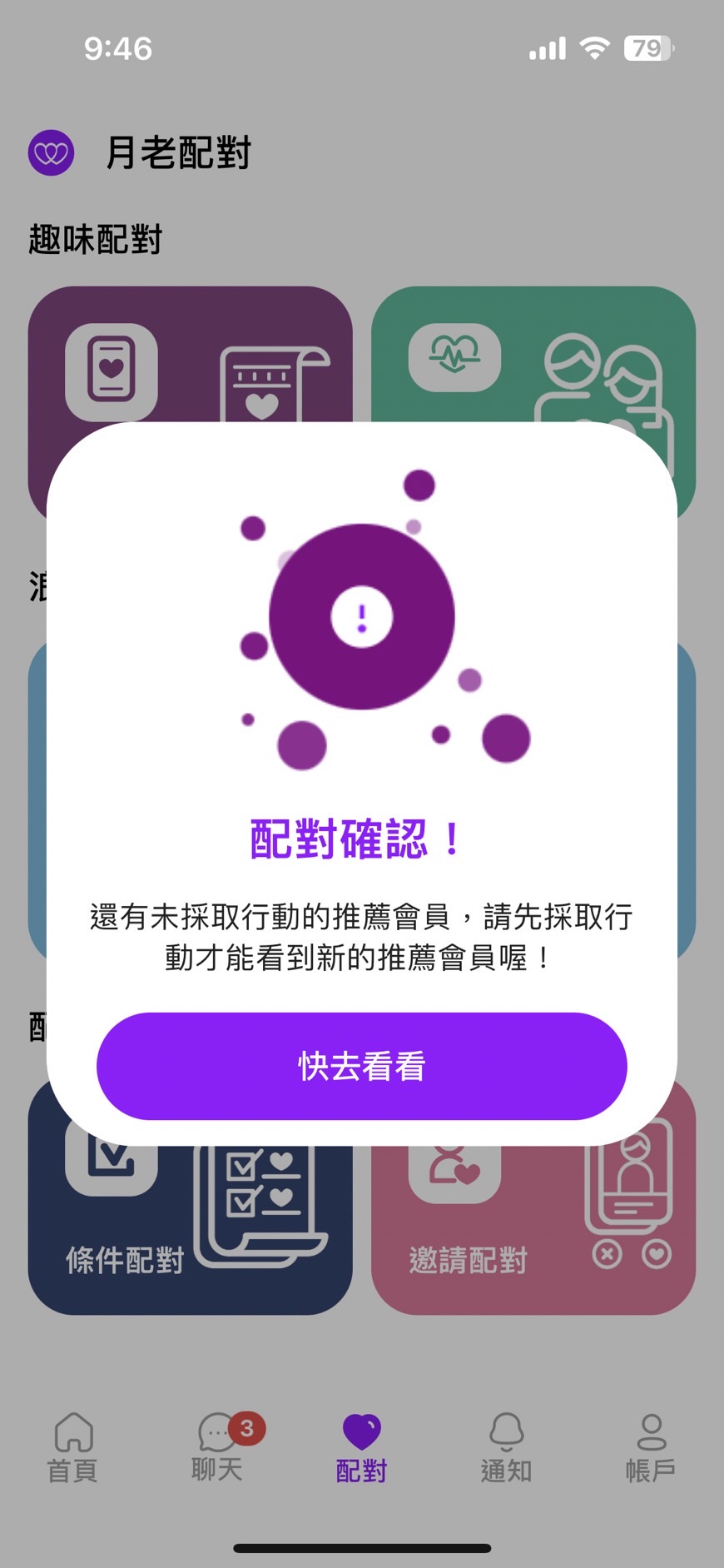 當點選任何一種配對模式時,如果有跳出配對確認,代表還有未採取行動的對象喔,系統推薦的每一個對象,你都必須要採取一個行動,有不喜歡、猶豫、喜歡三種,採取行動後就不會再看到相同會員了!